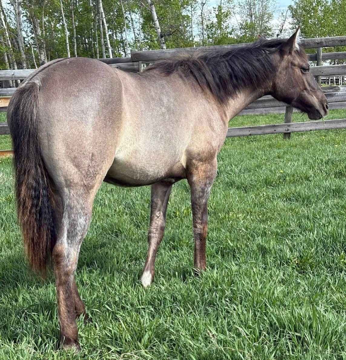 NINA” IS ANOTHER AQHA/NFQH 95% FILLY THAT I AM PROUD TO BRING TO THE ELITE INVITATIONALSALE IN RIMBEY, ALBERTA JUNE 21 2025. SHE IS GRULLA ROAN BUT SEEMS LIKE A BUCKSKIN SHEEN TOHER, NO MATTER WITH HER COLOR, FLOATING LONG STRIDED MOVEMENT SHE IS SURE TO GET YOUNOTICED AND SHE IS SMART AS A WHIP! SALE DAY FAST APPROACHING BE SURE TO ATTEND ON-LINECATALOGUE AVAILABLE SOON