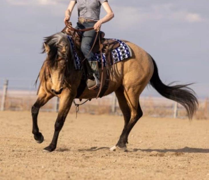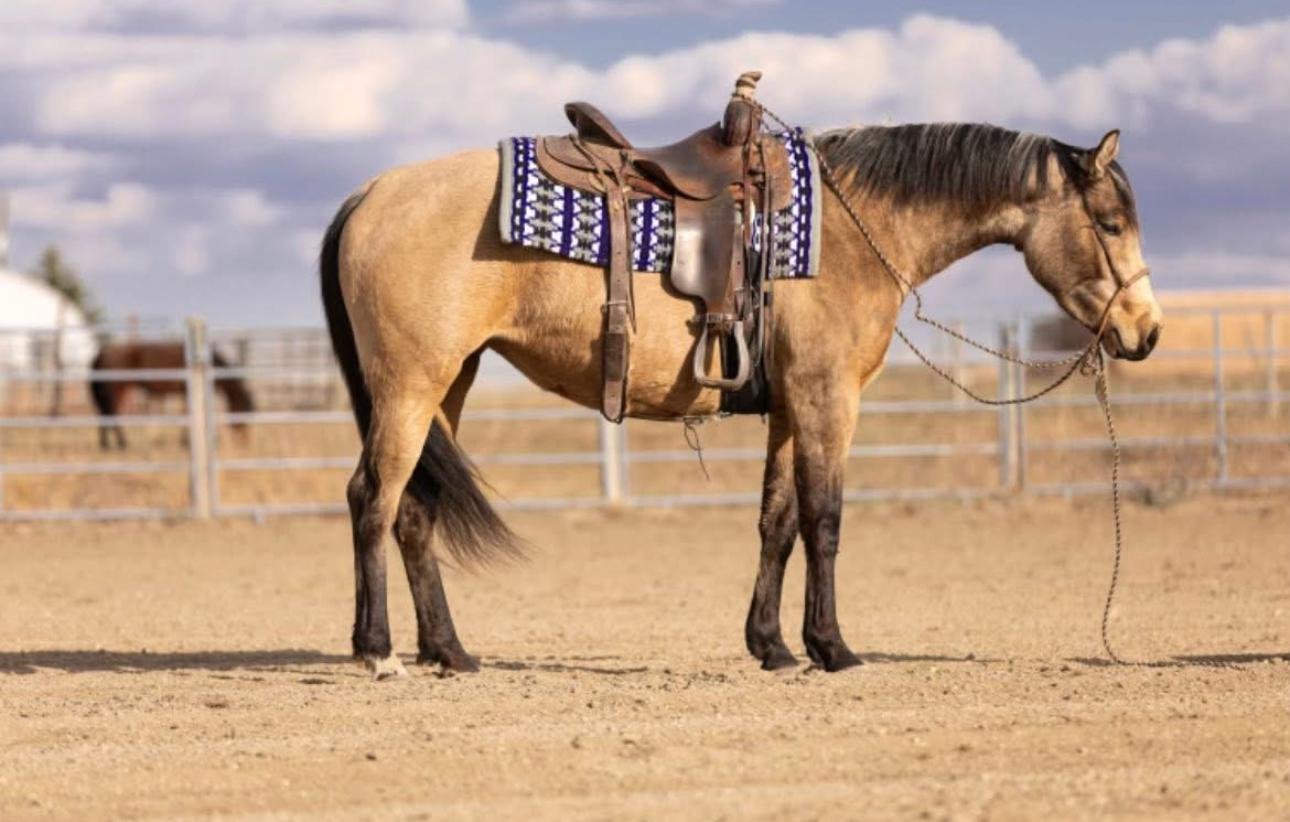 BLANCHE IS GENUINELY A SWEET-IN-YOUR-POCKET TYPE MARE. SHE HAS RECEIVED A REINING COW-HORSE START AND HAS SHOWN THE POTENTIAL TO GO IN ANY DIRECTION. THIS MARE IS WILLING TO LEARN AND PICKS UP RIGHT WHERE SHE IS LEFT OFF. SHE HAS HAD A GET ON AND GO ATTITUDE SINCE BEENING STARTED. BLANCHE HAS BEEN EXPOSED AND USED ON BUFFALO AND CATTLE. HAS GOOD FRONT END MOVEMENT AND IS WANTING TO HAVE A SOLID STOP. THIS MARE HAS THE POTENTIAL TO DO WELL BOTH INSIDE AND OUTSIDE THE ARENA. SHE HAS BEEN RIDDEN OUT ON TRAILS AND IN FIELDS WHILE KEEPING A RELAXED PACE ON A LOOSE REIN. SHE WILL BE USED IN THE BRANDING PEN THIS SPRING ALONG WITH BEING HAULED TO VARIOUS EVENTS TO BE SOCIALIZED. THIS MARE WILL MAKE ANYONE A GREAT PROSPECT FOR RANCH HORSE VERSATILITY, PLEASURE, ROPING, GENERAL RANCH WORK, COW WORK OR EVEN REINING. HER AGREEABLE AND LOVING PERSONALITY MAKES HER EASY TO GET ALONG WITH AND PLEASURABLE TO RIDE.
